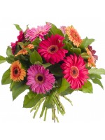 Un assemblage de gerberas et germinis aux couleurs vives, soutenus tout simplement par un riche feuillage.